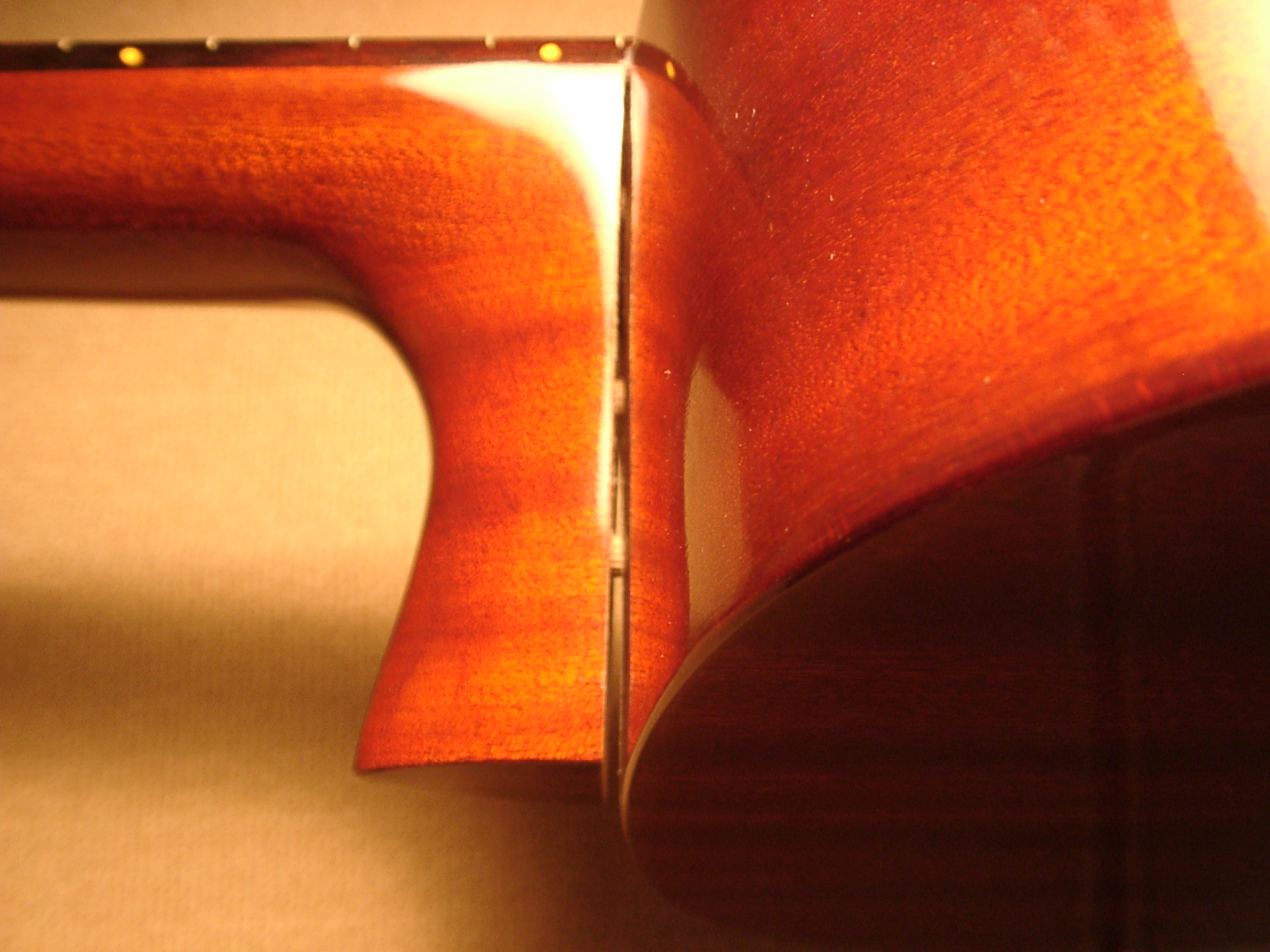 ネックが抜けました。ヒールの下と指板の下表面板、どちらも塗装がそのままでした。これでは剥がれます。